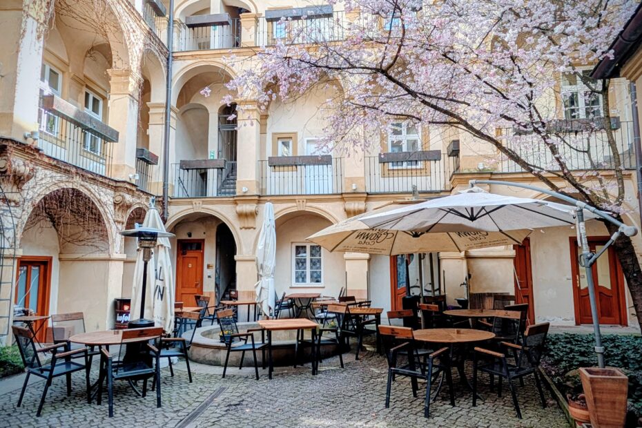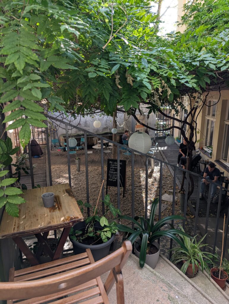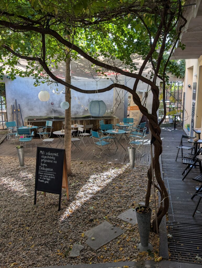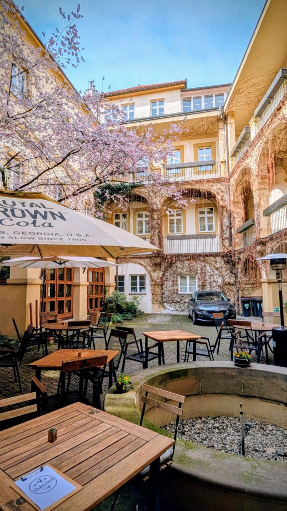 Poblíž Václavského náměstí se člověk bažící po troše klidu ocitne v tísni raz dva. Naštěstí je tu toto úžasné místo s malebným dvorkem. V létě je vyloženě radost sem zajít. Je tu kašna se zurčící vodou a strom, jehož rozložitá koruna stíní takřka celý dvorek. Kavárna má i vnitřní prostory, kde se příležitostně konají přednášky.