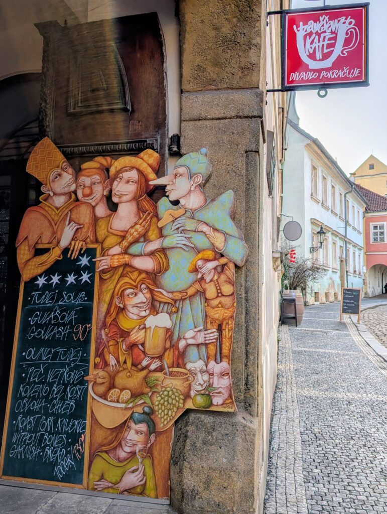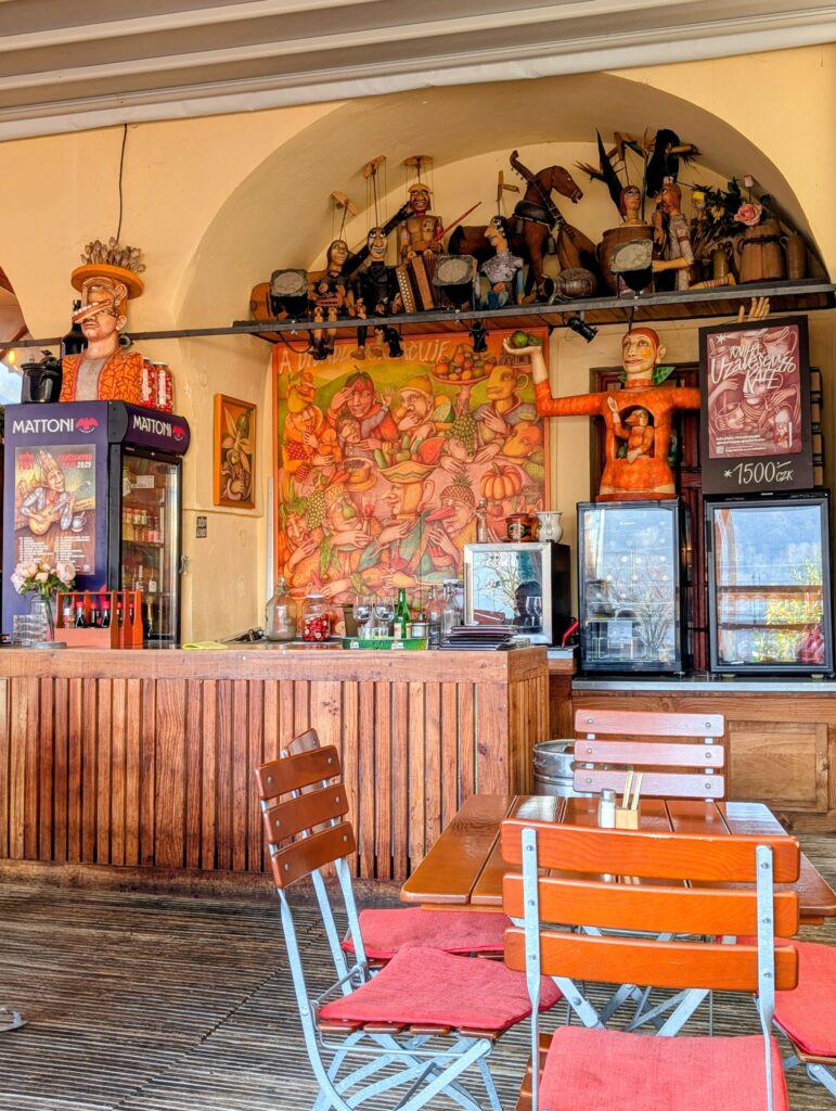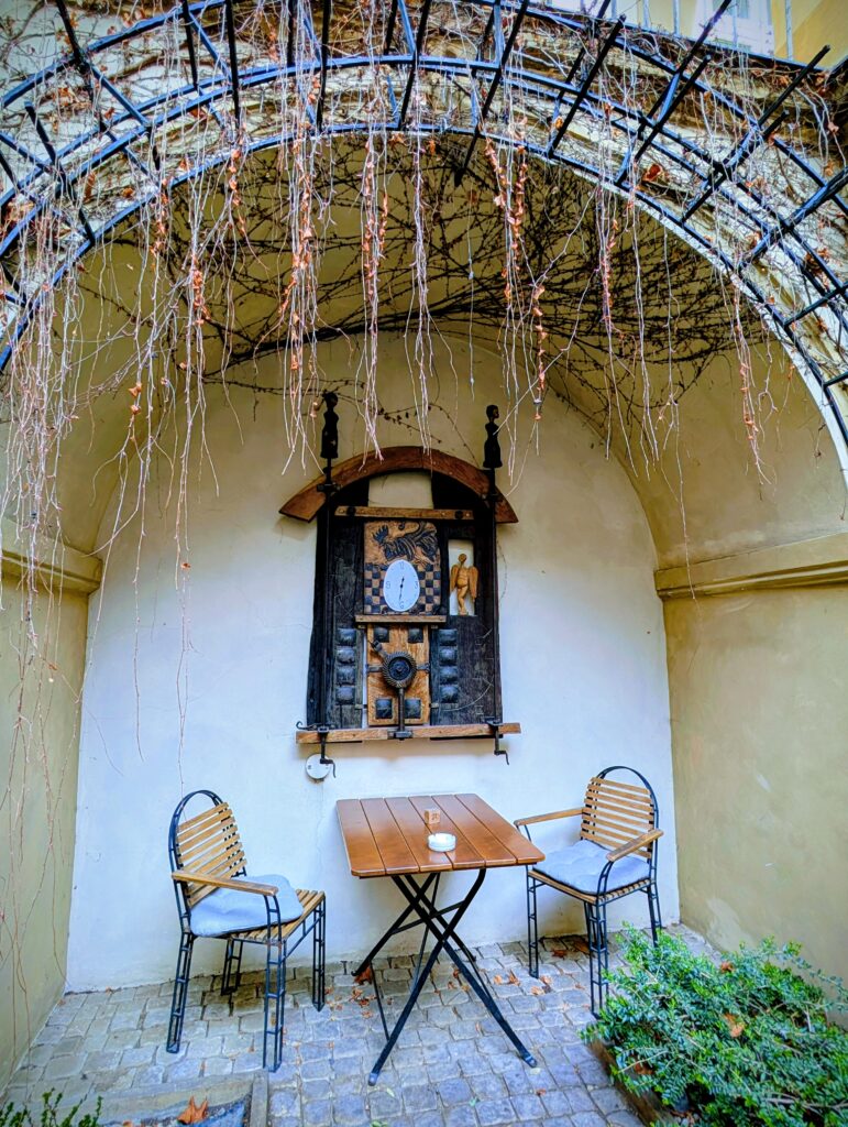 Malá Strana a Hradčany jsou útulných kaváren plné a tohle je přesně jedno z těch kouzelných míst, která tu tak nějak očekáváte, jen je najít. Sedět se dá venku na ulici i uvnitř, ale nejhezčí je dvorek. Nemá sice výhled na město, ale je obklopen čtyřmi křídly hezkého činžovního domu s pavlačemi, zazděnými arkádami, kašnou a břečťanem. Člověk si tu hned vybaví Hašlera a Patrolu Šlapeto.