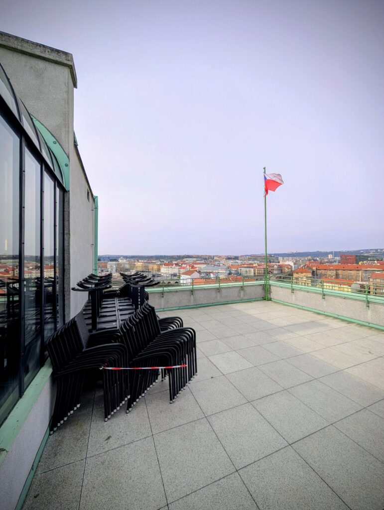 Za hezkého počasí oceníte především sezení na terase jízdárny s výhledem na Hrad. Slunce sem svítí celý den a terasa je tak rozlehlá, že ani introverti tu nebudou rušeni. V Jízdárně byla právě otevřena velkolepá výstava Fragmenty paměti, kterou byste si neměli nechat ujít.