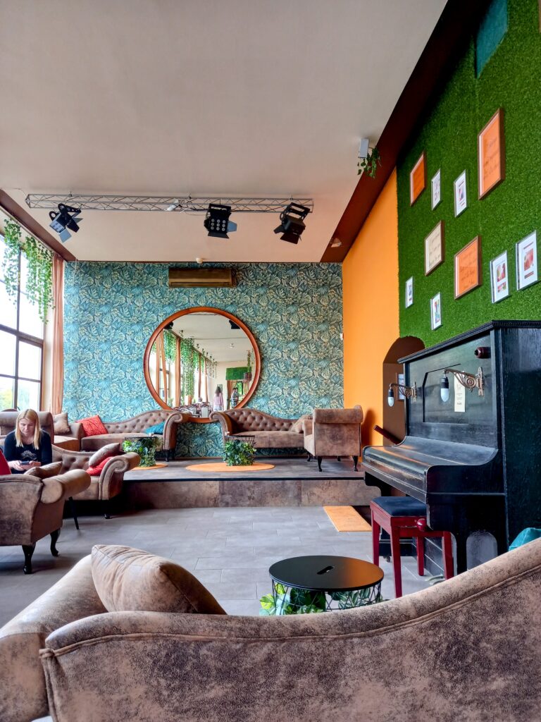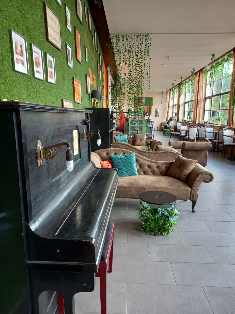 Káva je z fair trade pražírny, mají i bezkofeinové varianty a pro vegany ovesné mléko. K mání jsou zákusky, quiche a běžný sortiment nápojů.