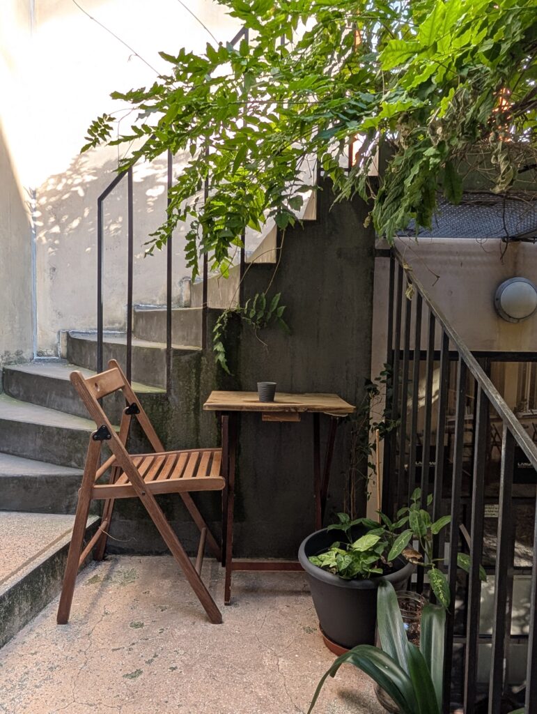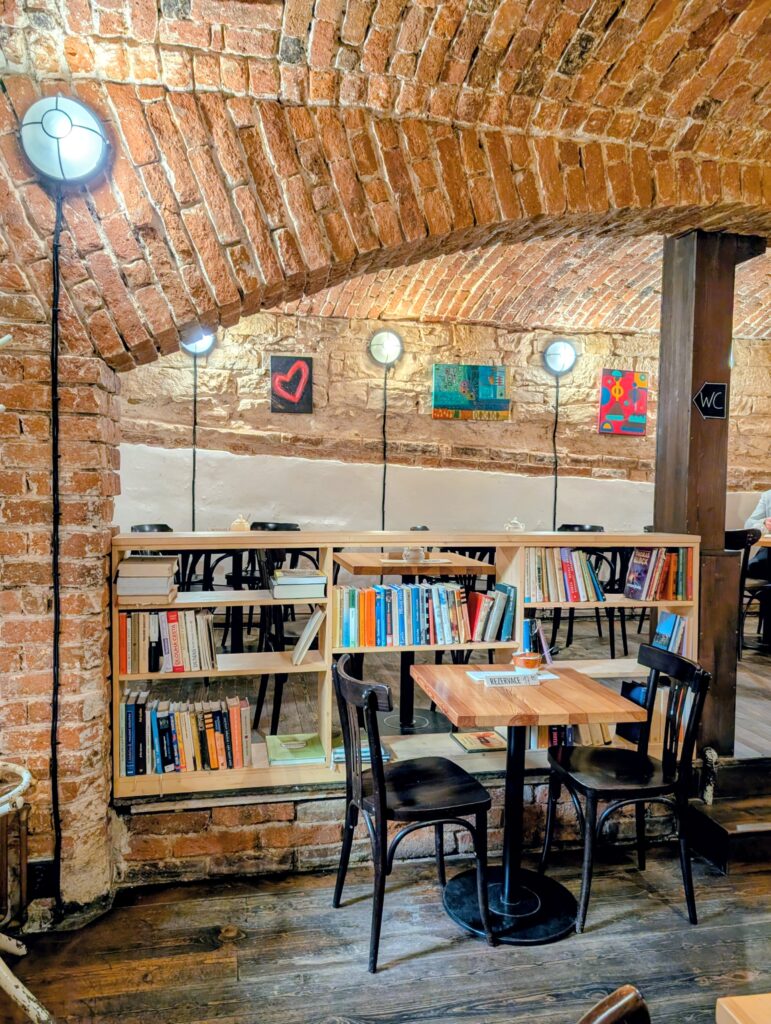 Industriální prostředí po truhlářské dílně má atmosféru i úroveň. Vždycky tu dostanu dobrou náladu. Zahrádce dominuje letitý kaštan. I tady je spousta knih co hledají čtenáře a miska s vodou co hledá vašeho psa.